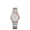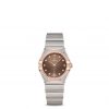 This 28 mm 18K Sedna™ gold and stainless steel model features a diamond-paved bezel, sun-brushed brown dial dial with diamond hour markers and scratch-resistant sapphire crystal. The hands, OMEGA logo, Constellation star and diamond holders are also in 18K Sedna™ gold.