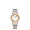 This 28 mm 18K yellow gold and stainless steel model features a bezel engraved with Roman numerals, crystal white silvery dial and scratch-resistant sapphire crystal. The hands, OMEGA logo, Constellation star and indexes are also in 18K yellow gold.