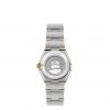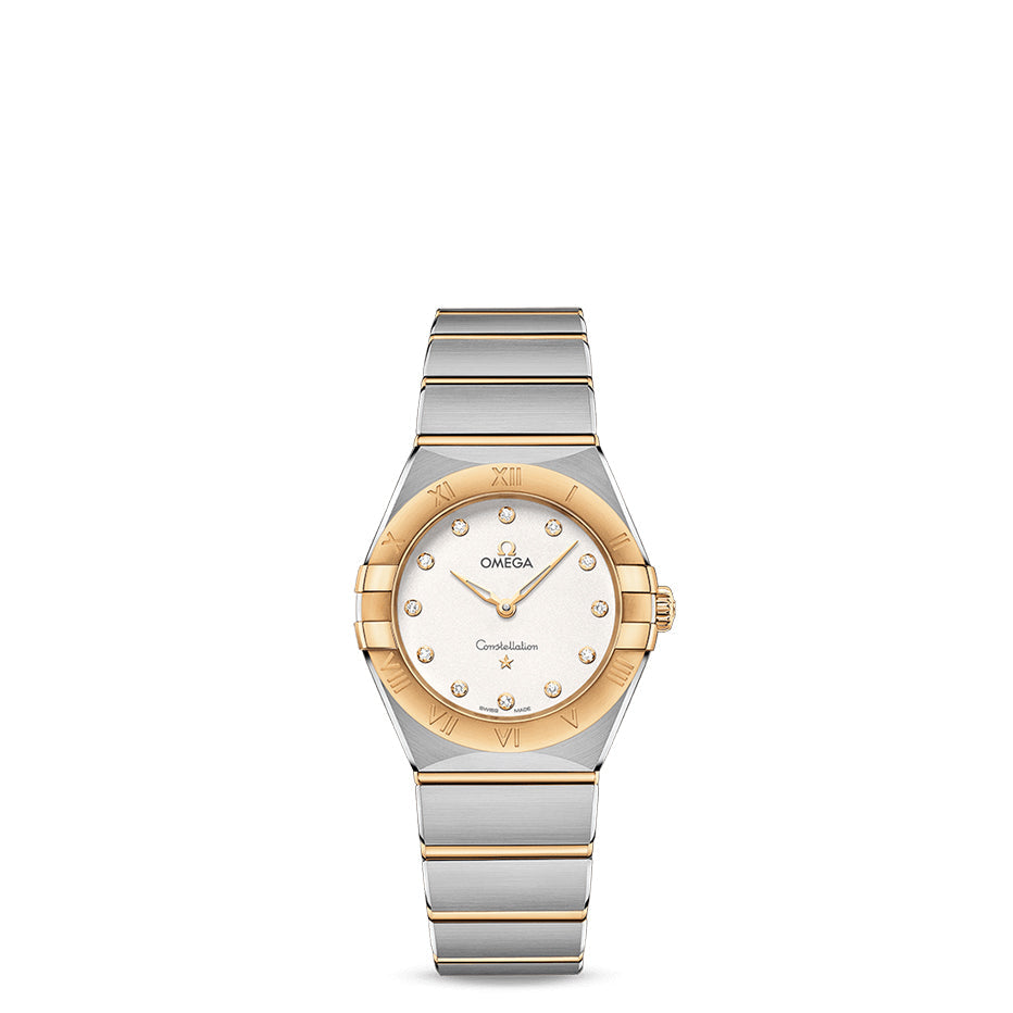 This 28 mm 18K yellow gold and stainless steel model features a bezel engraved with Roman numerals, crystal white silvery dial with diamond hour markers and scratch-resistant sapphire crystal. The hands, OMEGA logo, Constellation star and diamond holders are also in 18K yellow gold.