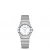 This 28 mm stainless steel model features a bezel engraved with Roman numerals, white mother-of-pearl dial with diamond hour markers and scratch-resistant sapphire crystal. The hands, OMEGA logo, Constellation star and diamond holders are in 18K white gold.