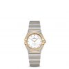 This 28 mm 18K yellow gold and stainless steel model features a diamond-paved bezel, white mother-of-pearl dial with diamond hour markers and scratch-resistant sapphire crystal. The hands, OMEGA logo, Constellation star and diamond holders are also in 18K yellow gold.