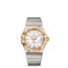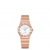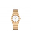 This 28 mm 18K yellow gold model features a bezel engraved with Roman numerals, white mother-of-pearl dial with diamond hour markers and scratch-resistant sapphire crystal. The bracelet, hands, OMEGA logo, Constellation star and diamond holders are also in 18K yellow gold.
