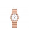 This 28 mm 18K Sedna™ gold model features a diamond-paved bezel, white mother-of-pearl dial with diamond hour markers and scratch-resistant sapphire crystal. The bracelet, hands, OMEGA logo, Constellation star and diamond holders are also in 18K Sedna™ gold.