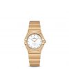 This 28 mm 18K yellow gold model features a diamond-paved bezel, white mother-of-pearl dial with diamond hour markers and scratch-resistant sapphire crystal. The bracelet, hands, OMEGA logo, Constellation star and diamond holders are also in 18K yellow gold.