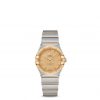 This 28 mm 18K yellow gold and stainless steel model features a bezel engraved with Roman numerals, champagne dial with silk-like pattern and scratch-resistant sapphire crystal. The hands, OMEGA logo, Constellation star and indexes are also in 18K yellow gold.