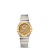 This 28 mm 18K yellow gold and stainless steel model features a bezel engraved with Roman numerals, sun-brushed champagne dial with diamond hour markers and scratch-resistant sapphire crystal. The hands, OMEGA logo, Constellation star and diamond holders are also in 18K yellow gold.