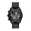 In this 44.25 mm model, the Speedmaster’s lunar history is celebrated on the blackened movement, which has been laser-ablated to represent the moon’s surface. The near side can be seen through the blackened skeletonised dial, while the far side can be seen through the caseback.