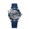 The watch is presented on a blue rubber strap and is driven by the OMEGA Master Chronometer Calibre 8800, which can be seen through the sapphire-crystal on the wave-edged caseback.