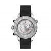 This 44 mm chronograph model is crafted from stainless steel and includes a polished black ceramic bezel with a white enamel diving scale. The pushers are also polished black ceramic, as well as the dial which features laser-engraved waves and a date window at 6 o’clock.