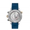 This 44 mm chronograph model is crafted from stainless steel and 18K yellow gold, and includes a polished blue ceramic bezel with a Ceragold™ diving scale. The pushers are also polished blue ceramic, as well as the dial which features laser-engraved waves and a date window at 6 o’clock.