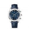This chronograph model features a two-zone black dial with Roman numeral hour indexes, a date window at 6 o’clock and a scratch-resistant sapphire crystal. The dial presents a small seconds subdial, as well as 60-minute and 12-hour counters on one dial for intuitive reading of elapsed time. The bezel is mounted on a 42 mm stainless steel case and is presented on a black leather strap.