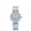 The attractive dial is made with blue pearled, mother-of-pearl, to accentuate the feminine touch.