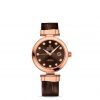 This OMEGA Ladymatic features a brown dial marked with diamond-set indexes and decorated in a supernova pattern with a date window at the 3 o’clock position. The exquisite dial is visible through a scratch-resistant sapphire crystal. The bezel, covered with diamonds arranged in a snow-set pattern, is mounted on a 34 mm 18K red gold case on an 18K red gold bracelet.
