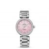 This OMEGA Ladymatic features a purple dial marked with diamond-set indexes and decorated in a supernova pattern with a date window at the 3 o’clock position. The exquisite dial is visible through a scratch-resistant sapphire crystal. The bezel is mounted on a 34 mm stainless steel case on a satin-brushed purple leather strap.