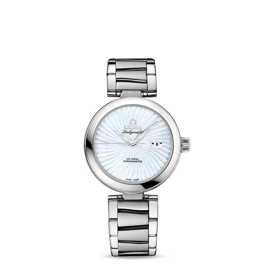 The OMEGA Ladymatic is a mesmerizing blend of extraordinary design and truly innovative watchmaking. It was crafted for the woman who cares as much about the technology in her timepiece as she does its appearance This OMEGA Ladymatic features a white mother-of-pearl dial decorated in a supernova pattern with a date window at the 3 o’clock position.