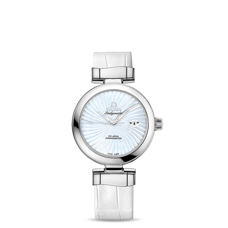 This OMEGA Ladymatic features a white mother-of-pearl dial decorated in a supernova pattern with a date window at the 3 o’clock position. The exquisite dial is visible through a scratch-resistant sapphire crystal. The bezel is mounted on a 34 mm stainless steel case on a white leather strap.