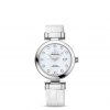 Radiating around the white pearled, mother-of-pearl dial, the bezel is also paved with snow-set diamonds, and an extra “Brilliant OMEGA cut” diamond has been placed within the polished crown.