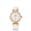 In this model, 18K yellow gold has been used to create both the 34 mm case and the waved links of the white leather strap. This stunning material also features on the polished alpha-shaped hands, as well as 11 indexes, which are set with diamonds.
