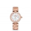 This OMEGA Ladymatic features a white mother-of-pearl dial marked with diamond-set indexes and decorated in a supernova pattern with a date window at the 3 o’clock position. The exquisite dial is visible through a scratch-resistant sapphire crystal. The bezel is mounted on a 34 mm 18K yellow gold case on a white leather strap.