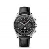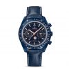 The 44.25 mm chronograph features a blue ceramic case complemented by a blue ceramic bezel ring with an OMEGA Ceragold™ tachymeter scale. It is presented on a blue leather strap with a blue ceramic and ceramised titanium foldover clasp.