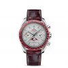 Cased in 950 platinum and circled with a red alumina bezel ring, this watch is presented on a burgundy leather strap with a polished-brushed foldover clasp.