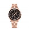 Presented on a five-arched-links-per-row bracelet, this 42 mm Moonwatch in 18K Sedna™ gold features sapphire crystal glass on the front as well as on the caseback. Inspired by the 4th generation Speedmaster style worn on the moon, it also includes an asymmetrical case, black step dial and the famous dot over 90 on the anodised aluminium bezel ring.