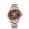 This 45.5 mm model in robust O-MEGASTEEL features a polished orange ceramic bezel with its diving scale in liquid ceramic and Super-LumiNova. Through the protuberant and domed sapphire crystal, the lacquered gradient dial transitions from grey to black, and has been given four Arabic numerals in orange, as well as 18K white gold hands and hour markers, which are all coated with white Super-LumiNova.