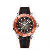This 45.5 mm model in robust O-MEGASTEEL features a polished orange ceramic bezel with its diving scale in liquid ceramic and Super-LumiNova. Through the protuberant and domed sapphire crystal, the lacquered gradient dial transitions from grey to black, and has been given four Arabic numerals in orange, as well as 18K white gold hands and hour markers, which are all coated with white Super-LumiNova.