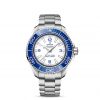 This 45.5 mm model in robust O-MEGASTEEL features a polished blue ceramic bezel with its diving scale in white enamel. Through the protuberant and domed sapphire crystal, the lacquered white dial has been given four Arabic numerals in blue, as well as 18K white gold hands and hour markers, which are all coated with white Super-LumiNova.