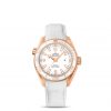 The OMEGA Seamaster Planet Ocean 600M is water resistant to 60 bar (600 metres / 2000 feet), and has a helium-escape valve. The 37.5 mm 18K red gold case is presented on a white leather strap. Powering this timepiece is the OMEGA Co-Axial calibre 8521, visible through the transparent caseback.
