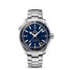 The polished blue bi-directional rotating bezel is compelete with a bright orange GMT scale and helium-escape valve at 10 o’clock on the case. The 44 mm stainless steel case is presented on a matching bracelet and is fitted with the OMEGA Co-Axial calibre 8605. This timepiece is water resistant to 60 bar (600 metres / 2000 feet).
