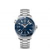 This model, with its scratch-resistant sapphire crystal, features a blue ceramic dial with Arabic numerals and a date window at the 3 o’clock position. The blue ceramic unidirectional bezel with OMEGA Liquidmetal™ diving scale is mounted on a 39.5 mm stainless steel case.
