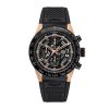 Other features include an alveol screw-in caseback and a black structured rubber strap with orange stitching and lining.