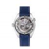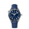 This model, with its scratch-resistant sapphire crystal, features a blue dial with a date window at the 3 o’clock position. The blue unidirectional rotating divers’ bezel is mounted on a 42 mm titanium case and is presented on a blue rubber strap.
