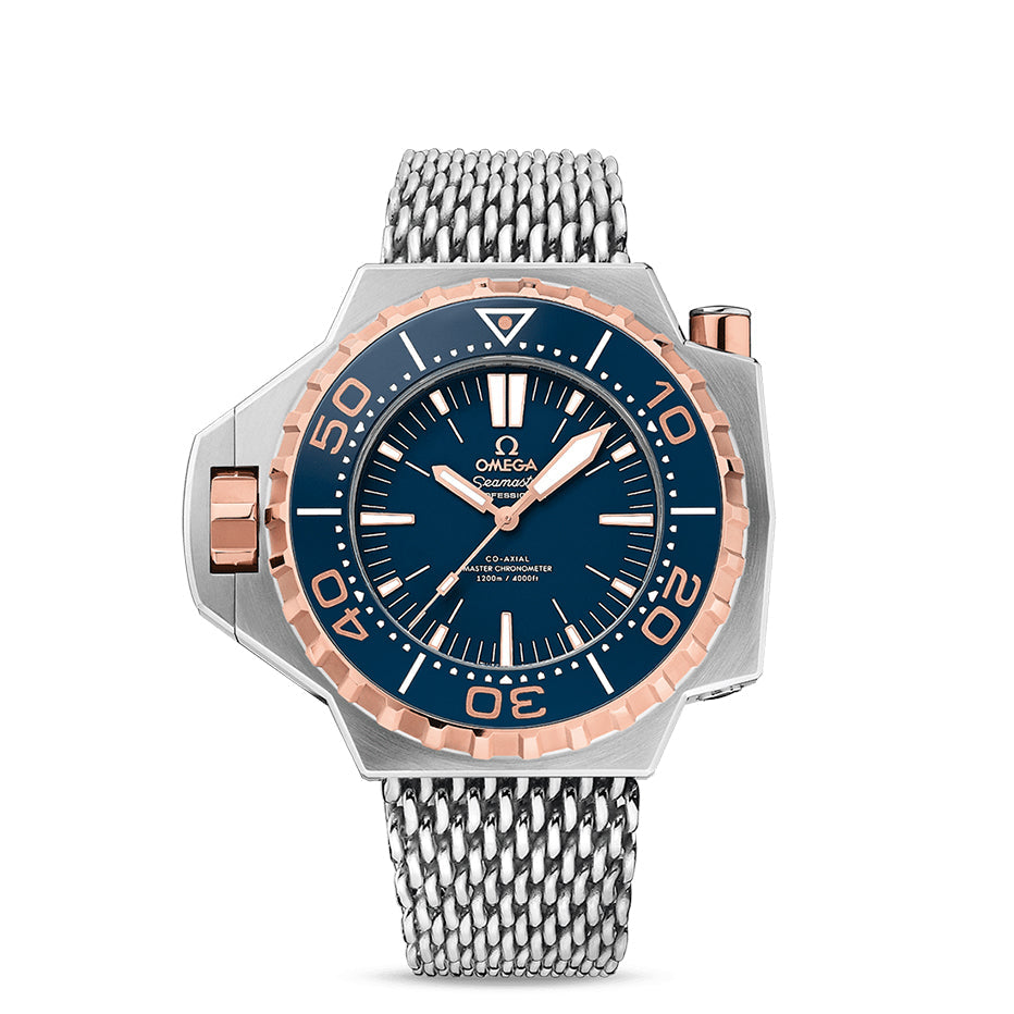 The unique case combines 18K Sedna™ gold along with grade 5 titanium for lightweight comfort. Sedna™ gold has also been used on the hands and indexes, with Super-LumiNova for increased visibility. Completing the look, a polished blue bezel has been added with OMEGA Ceragold™ numerals, as well as a blue lacquered dial.