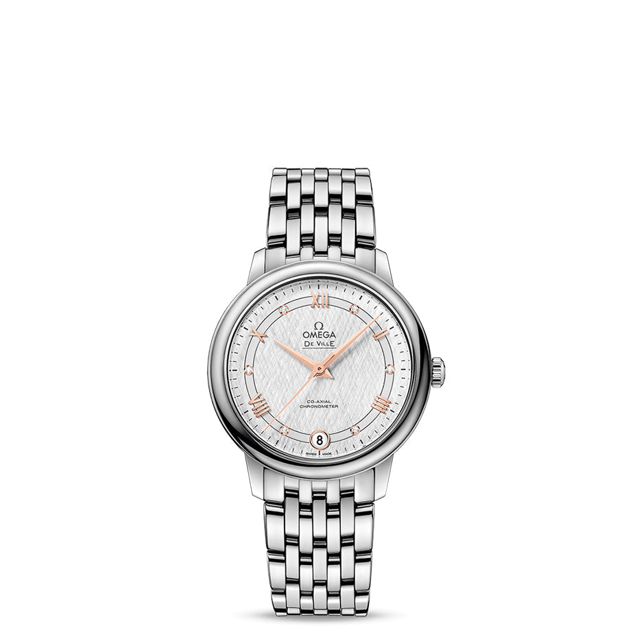 This De Ville Prestige is presented on a stainless steel bracelet and is powered by the OMEGA Co-Axial Chronometer Calibre 2500.