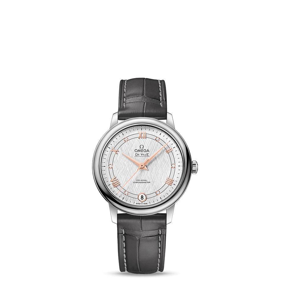 This De Ville Prestige is presented on a grey leather strap and is powered by the OMEGA Co-Axial Chronometer Calibre 2500.