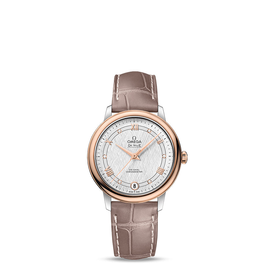 This De Ville Prestige is presented on a taupe-brown leather strap and is powered by the OMEGA Co-Axial Chronometer Calibre 2500.
