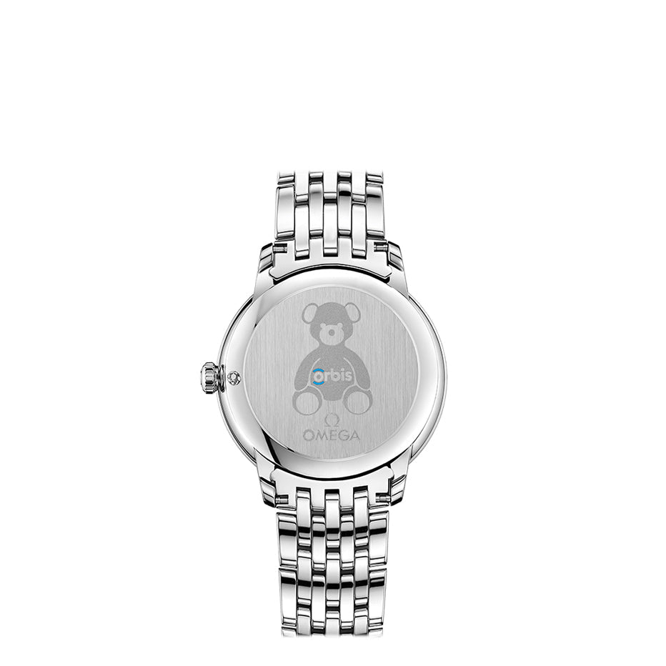The watch has a 32.7 mm stainless steel case and a white mother-of-pearl dial that features a layered OMEGA teddy bear pattern. The teddy bear logo on the vertically brushed caseback has also been specially designed just for this collection.