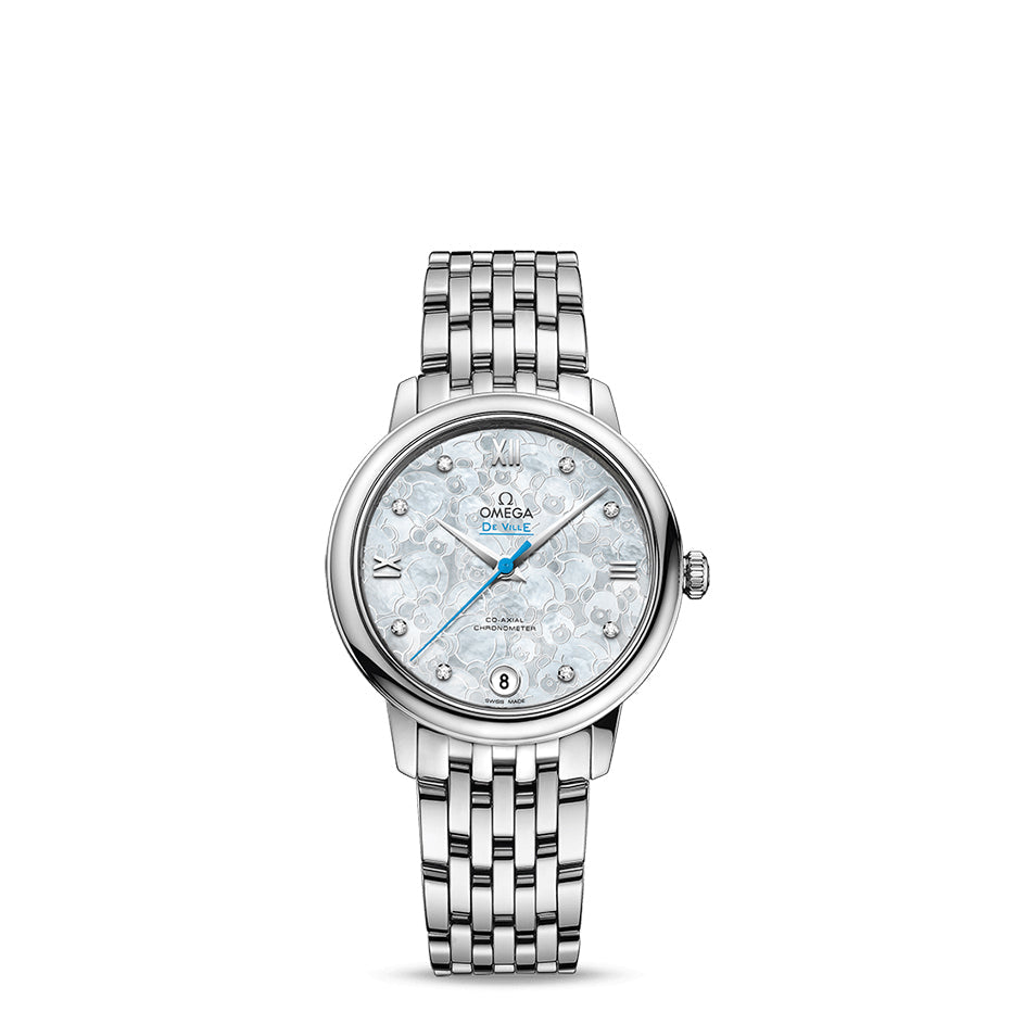 The dial features polished-domed Roman numerals, diamond indexes and a blue central seconds hand. There is a date window at 6 o’clock and the watch comes presented on a polished Prestige bracelet. Inside, it is equipped with OMEGA’s Co-Axial Calibre 2500.