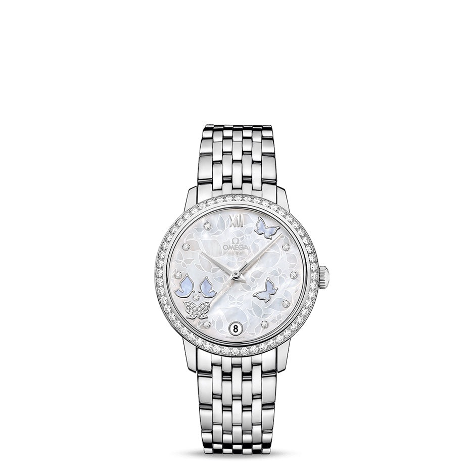 These timepieces are characterised by pure styling with luxury finishes, and exude a timeless design. This model features an enchanting white mother-of-pearl dial with a decorative butterfly design and nine diamond indexes in 18K white gold holders.