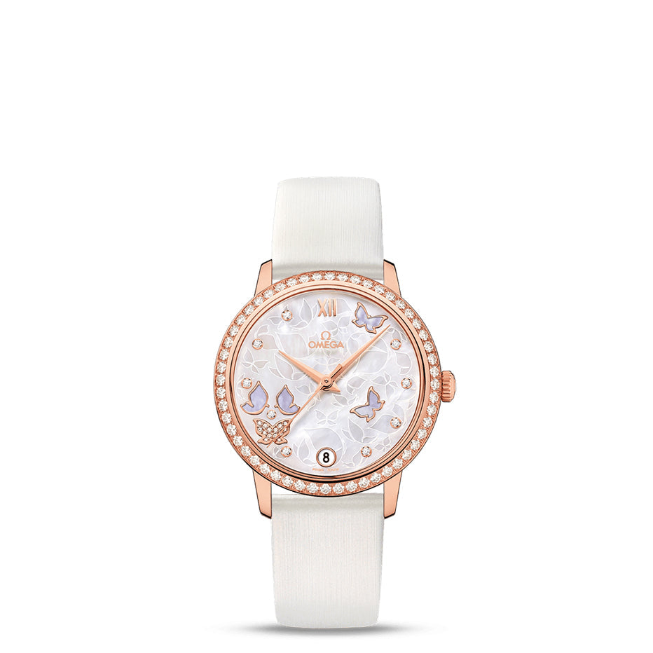 A scratch-resistant sapphire crystal protects this striking dial. The diamond-set bezel is mounted on a 32.7 mm 18K red gold case and is presented on a white satin-brushed leather strap with a mother-of-pearl effect. At the heart of this timepiece is the Co-Axial calibre 2500.