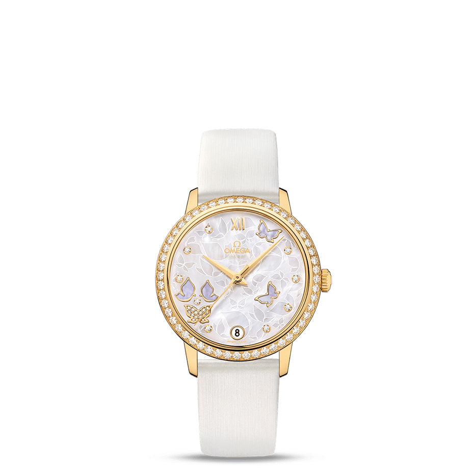A scratch-resistant sapphire crystal protects this striking dial. The diamond-set bezel is mounted on a 32.7 mm 18K yellow gold case and is presented on a white satin-brushed leather strap with a mother-of-pearl effect. At the heart of this timepiece is the Co-Axial calibre 2500.