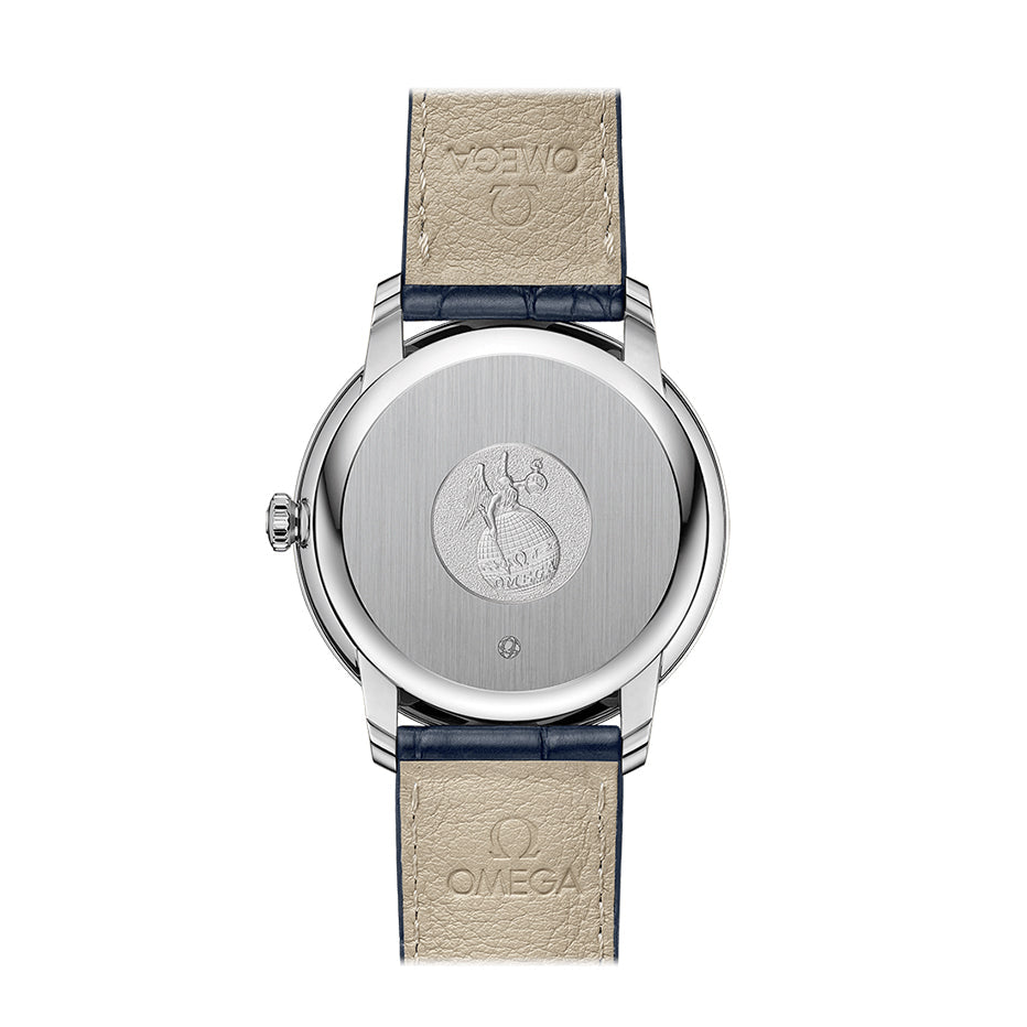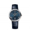 Surrounding the scratch-resistant sapphire crystal, the stainless steel bezel is mounted on a 39.5 mm case, which is presented on a blue leather strap. At the heart of this timepiece is the OMEGA Co-Axial Calibre 2500.