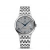 This model features a grey dial with a silk-like pattern and an opaline finish. The hands are blued and the hour-markers include six blued cabochons as well as blued Roman numerals. There is a date window at 3 o’clock.