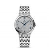 This model features a sun-brushed silvery opaline dial with red gold-coloured Roman numeral hour markers and polished cabochons. The striking dial, with its date window at 3 o’clock, is protected by a scratch-resistant sapphire crystal.