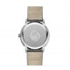 This stainless steel model features a silvery sun-brushed dial on an embossed vertical structure that is encircled by a “railway” minute track. With a date window at 6 o’clock, the applied OMEGA logo, the alternating Roman numerals and cabochons are PVD blackened, along with the hands.