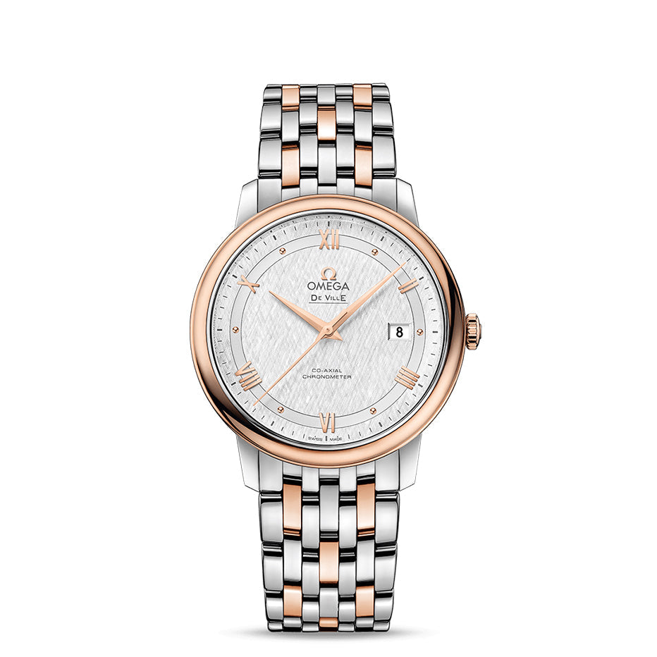 This De Ville Prestige is presented on a stainless steel and 18K red gold bracelet and is powered by the OMEGA Co-Axial Chronometer Calibre 2500.