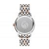 This stainless steel and 18K red gold model features a silvery sun-brushed dial on an embossed vertical structure that is encircled by a “railway” minute track. With a date window at 6 o’clock, the applied OMEGA logo, the alternating Roman numerals and cabochons are red-gold plated, along with the hands.