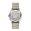 This stainless steel and 18K yellow gold model features a silvery sun-brushed dial on an embossed vertical structure that is encircled by a “railway” minute track. With a date window at 6 o’clock, the applied OMEGA logo, the alternating Roman numerals and cabochons are yellow-gold plated, along with the hands.
